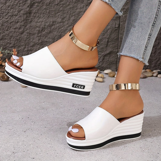 Diseño slip-on de punta abierta en blanco sólido, realzado con un elegante acento dorado en el tobillo. Con suela gruesa de poliuretano para un soporte duradero, son perfectas para un estilo casual y sofisticado.