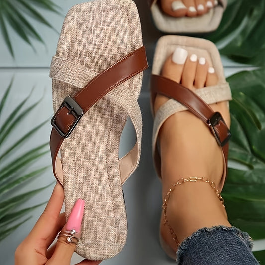 Sandalias tipo slide para mujer en elegante beige con tiras marrones. Fáciles de poner, con tacón plano y diseño abierto para máxima comodidad en verano. Suela de PVC duradera y forro de tela, ¡Estilo y confort en cada p